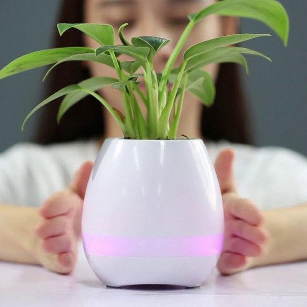 Parlante bluetooth 3W con lámpara led de 7 colores. Espacio para sembrar plantas pequeñas las cuales activan sonidos al tacto. Tiempo de reproducción 4-5 horas. Alcance del bluetooth de 10 metros. Batería de 1200 mAh. De 11.4 x 11.4 x 11.7 cm.